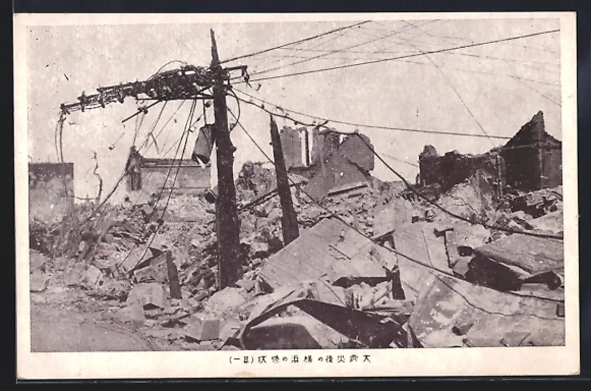 AK Yokohama, Erdbebenschäden an einer Strasse, Ruinen u. zerstörte Stromleitung, Erdbeben 1923