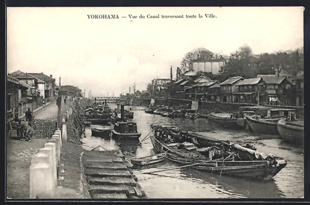 AK Yokohama, Vue du canal traversant toute la Ville, Kanalpartie mit Lastkähnen