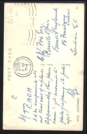 Personenbezogene Daten auf der Rückseite der Karte wurden durch blauen Textmarker unkenntlich gemacht. Die blauen Stellen sind auf die Vorderseite durchgeweicht und wirken sich negativ auf das Postkartenfoto aus