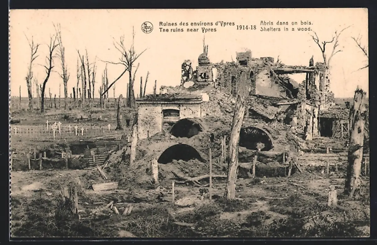 AK Ypres, Ruines des environs d`Ypres, Abris dans un bois