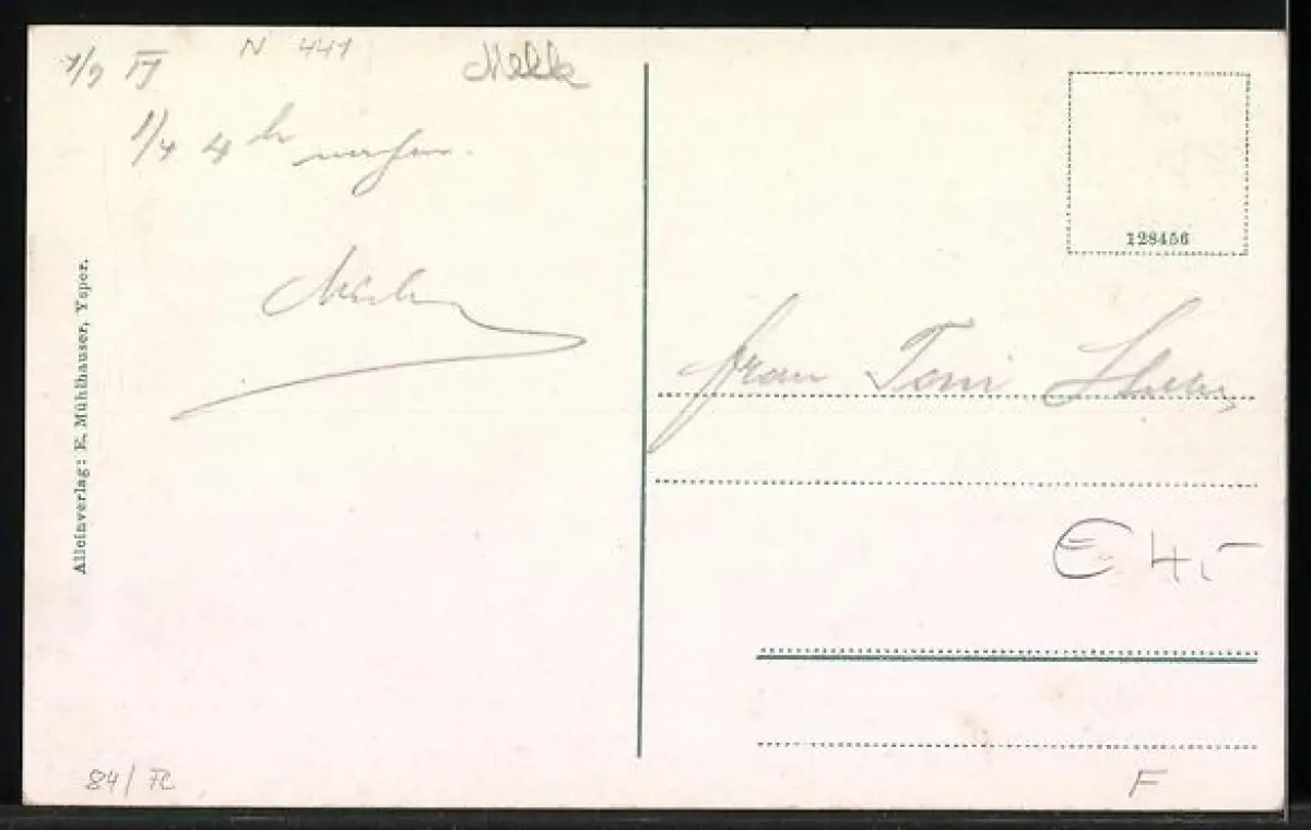 Personenbezogene Daten auf der Rückseite der Karte wurden durch blauen Textmarker unkenntlich gemacht. Die blauen Stellen sind auf die Vorderseite durchgeweicht und wirken sich negativ auf das Postkartenfoto aus