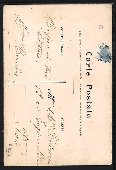 Personenbezogene Daten auf der Rückseite der Karte wurden durch blauen Textmarker unkenntlich gemacht. Die blauen Stellen sind auf die Vorderseite durchgeweicht und wirken sich negativ auf das Postkartenfoto aus