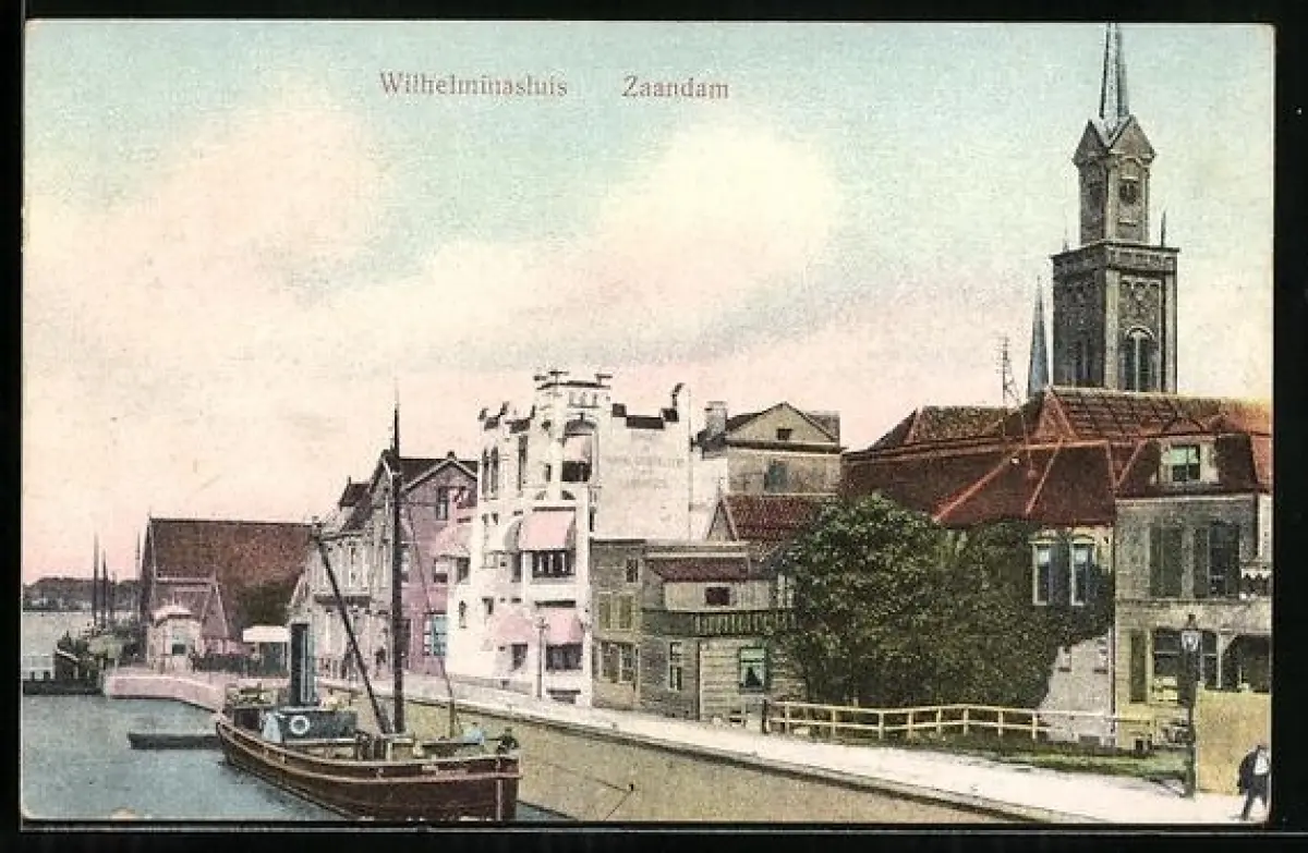 AK Zaandam, Wilhelminasluis, Stadtblick mit Schleuse