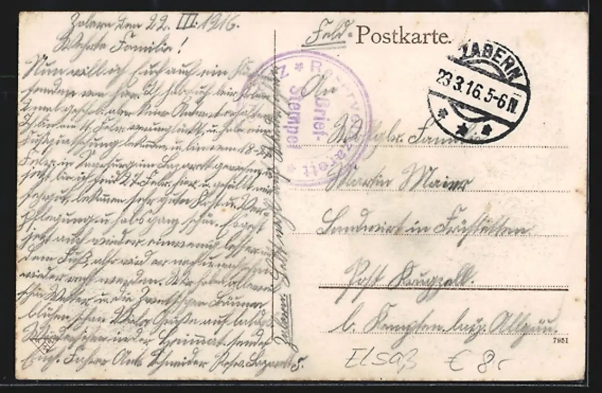 Personenbezogene Daten auf der Rückseite der Karte wurden durch blauen Textmarker unkenntlich gemacht. Die blauen Stellen sind auf die Vorderseite durchgeweicht und wirken sich negativ auf das Postkartenfoto aus