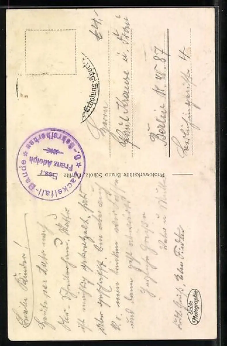 Personenbezogene Daten auf der Rückseite der Karte wurden durch blauen Textmarker unkenntlich gemacht. Die blauen Stellen sind auf die Vorderseite durchgeweicht und wirken sich negativ auf das Postkartenfoto aus
