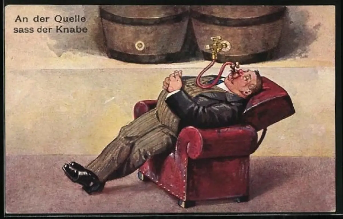 AK Zapfhahn im Mund eines Mannes, der auf einem roten Sessel liegt