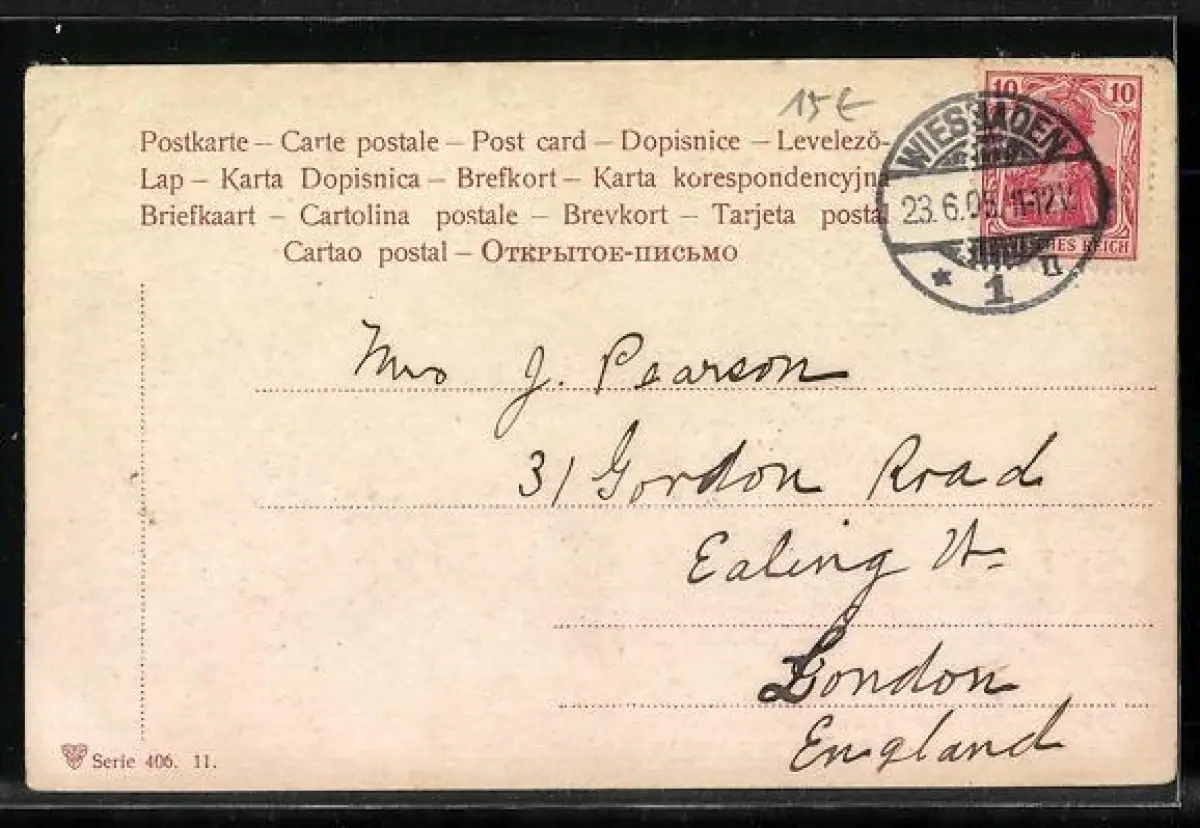 gelaufen 1905, Eckknick re. oben, Bugspuren li. oben, guter Zustand