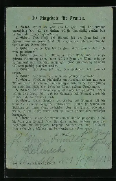 AK Zehn Ehegebote für Frauen, 1. Gebot: Er ist der Herr..., 2. Gebot: Das Wohl des Mannes..., frauenfeindlicher Humor