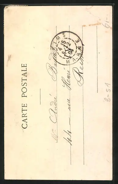 Personenbezogene Daten auf der Rückseite der Karte wurden durch blauen Textmarker unkenntlich gemacht. Die blauen Stellen sind auf die Vorderseite durchgeweicht und wirken sich negativ auf das Postkartenfoto aus