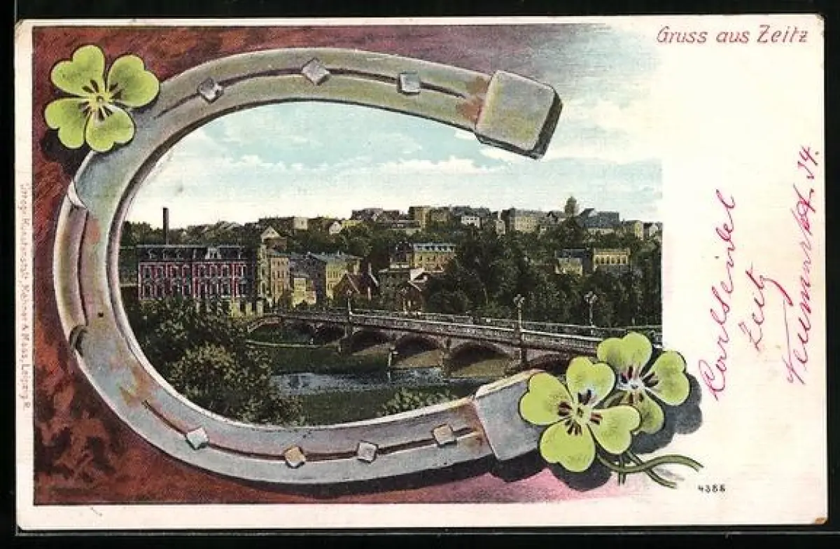 AK Zeitz, Ortsansicht mit Brücke, Hufeisen mit vierblättrigen Kleeblättern