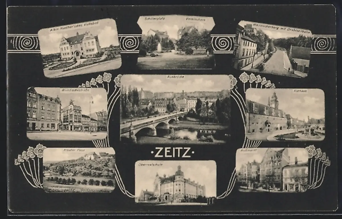AK Zeitz, Schillerplatz, Albin Naether`sches Volksbad, Kloster Posa, Rossmarkt, Auebrücke