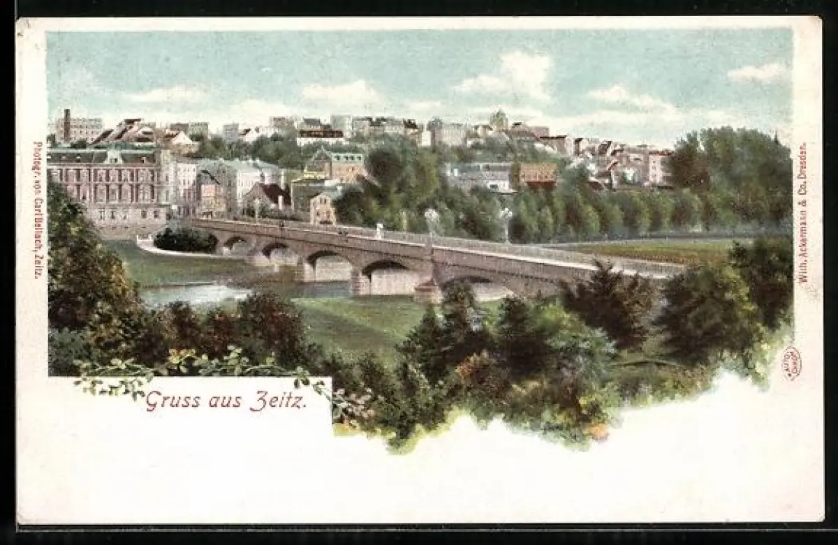 AK Zeitz, Stadtansicht mit Brücke über die Weisse Elster