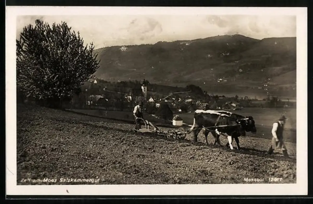 AK Zell am Moos, Ortsansicht mit Kirche, im Vordergrund Bauern mit Pflug