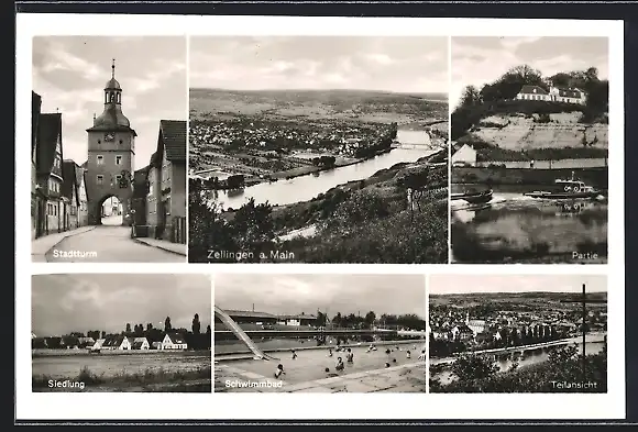 AK Zellingen a. Main, Gesamtansicht, Stadtturm, Siedlung und Schwimmbad