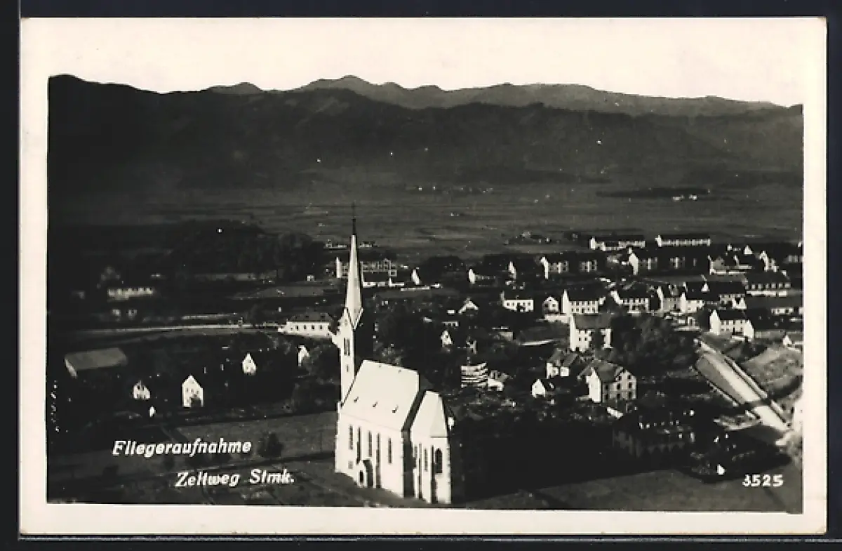 AK Zeltweg /Stmk., Fliegeraufnahme der Kirche und Ort