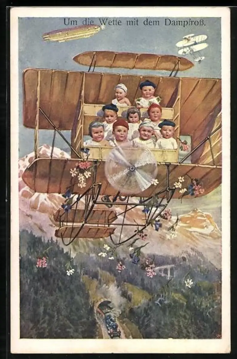 AK Zeppelin, Kinder in einem Flugzeug, Eisenbahn