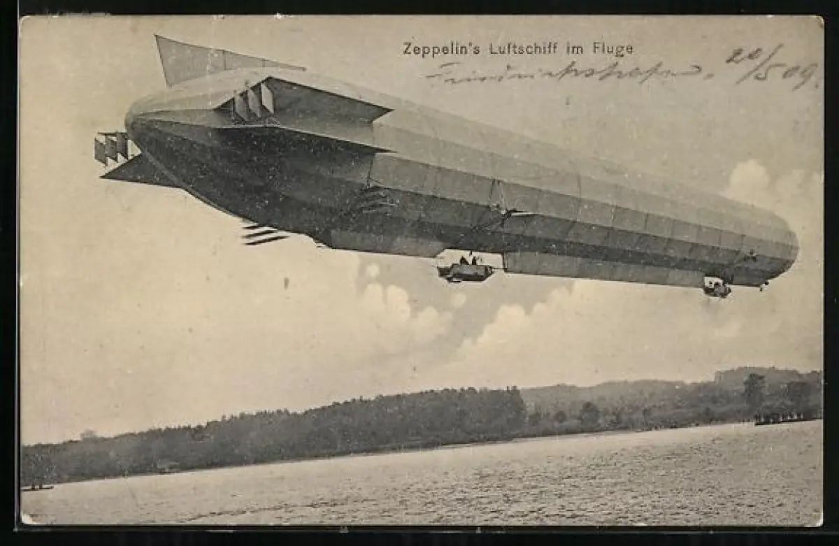 AK Zeppelin`s Luftschiff im Fluge über einem Gewässer