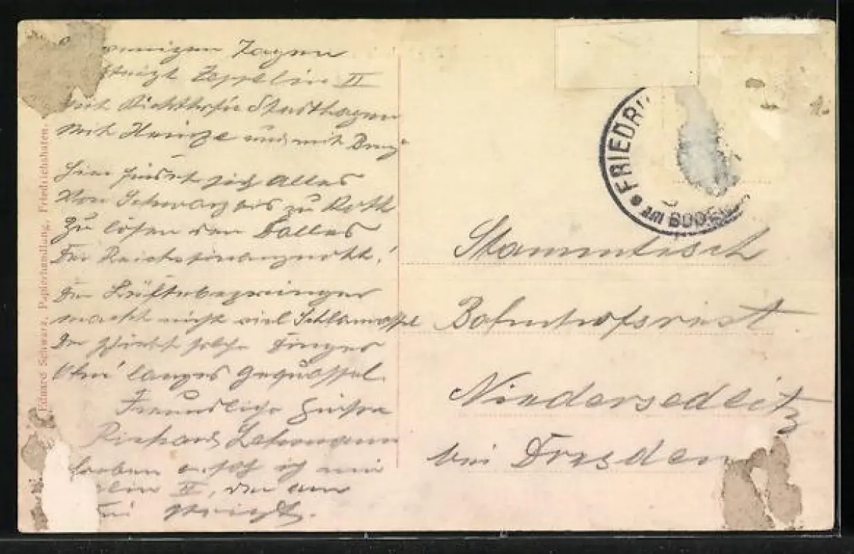 alte Ansichtskarte, gelaufen, Ecken bestoßen, rückseitig Oberflächenschaden, rückseitig Klebe- und Papierreste, reparierter Riss links oben
