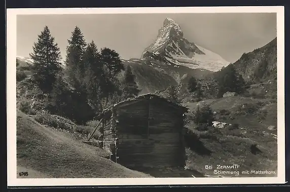 AK Zermatt, Bergpartie mit Scheune und Matterhorn