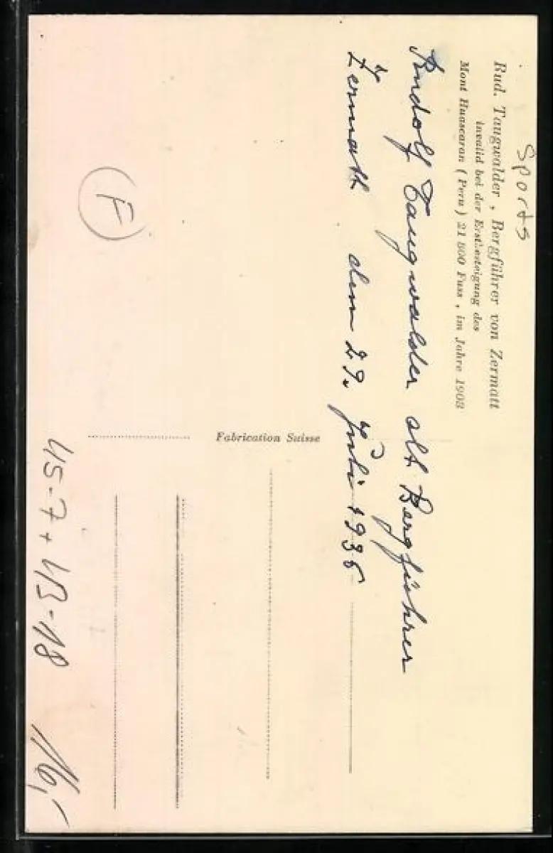 AK Zermatt, Bergsteiger Rudolf Taugwalder, invalid bei der Erstbesteigung des Mont Huascaran