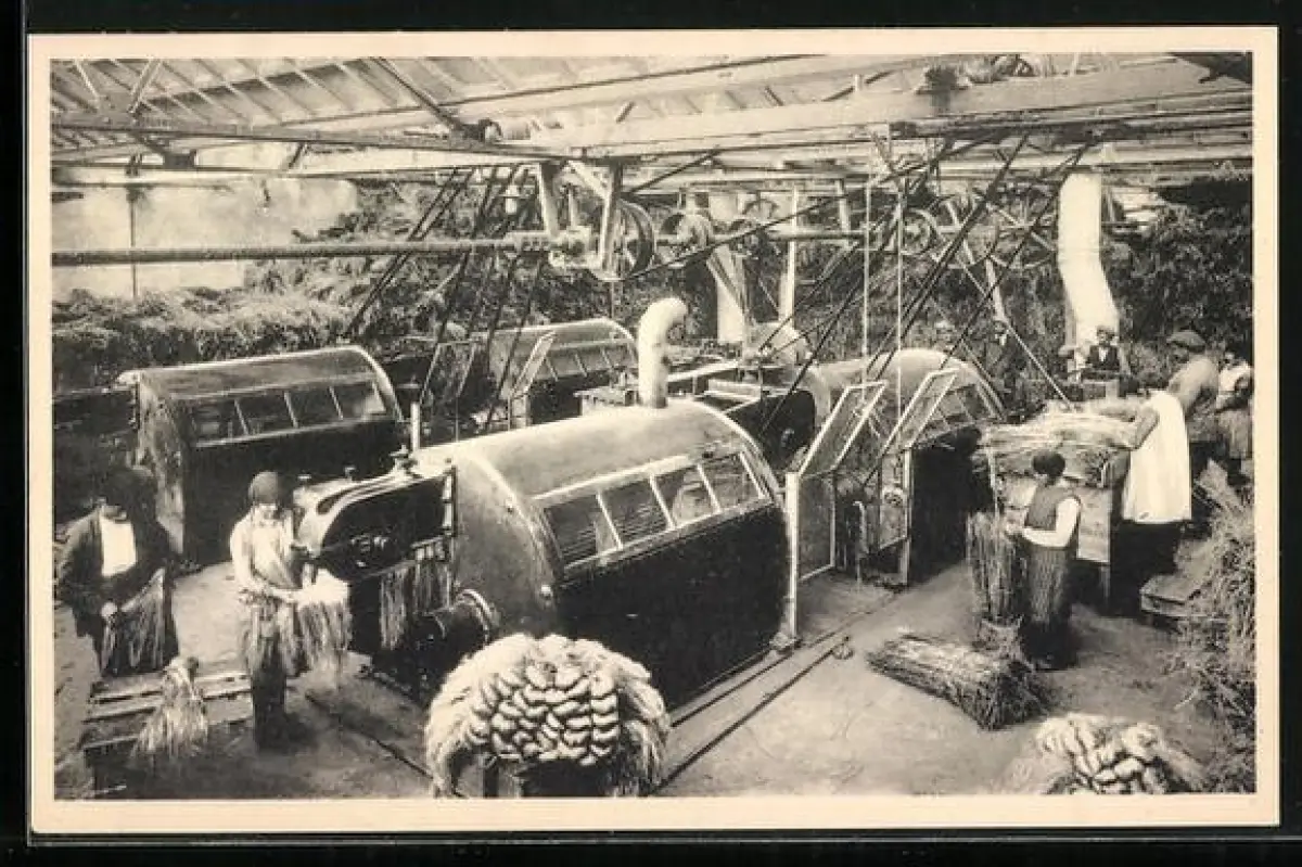 AK Zicht in een moderne vlasvezelfabriek, Arbeiter verarbeiten Flachs in der Fabrik