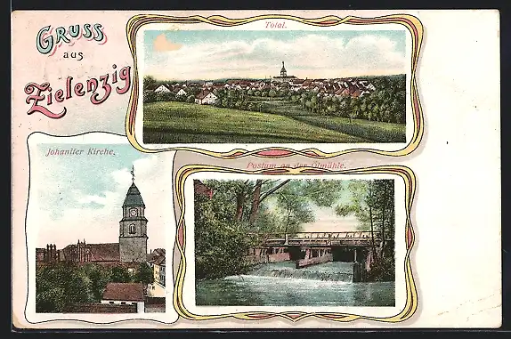 AK Zielenzig, Johaniter Kirche, Postum an der Ölmühle, Ortsansicht