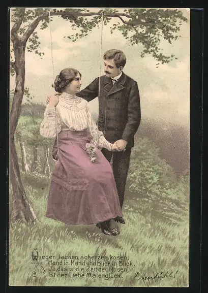 AK Zij rusten uit van`t vrolijk spel.., Liebespaar und Schaukel