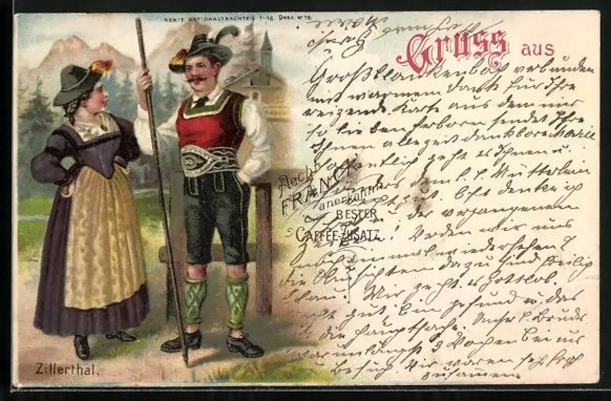 AK Zillerthal, Aecht Franck, Anerkannter Bester Kaffee-Zusatz, Bauernpaar in Trachten