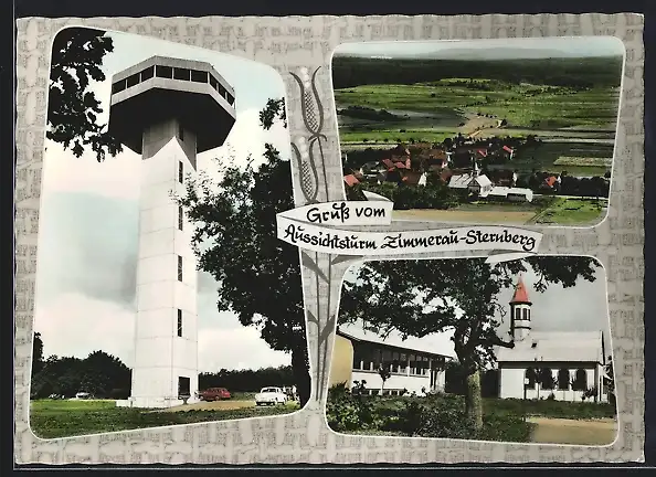 AK Zimmerau-Sternberg, Aussichtsturm am Büchelberg, Kirche, Totale