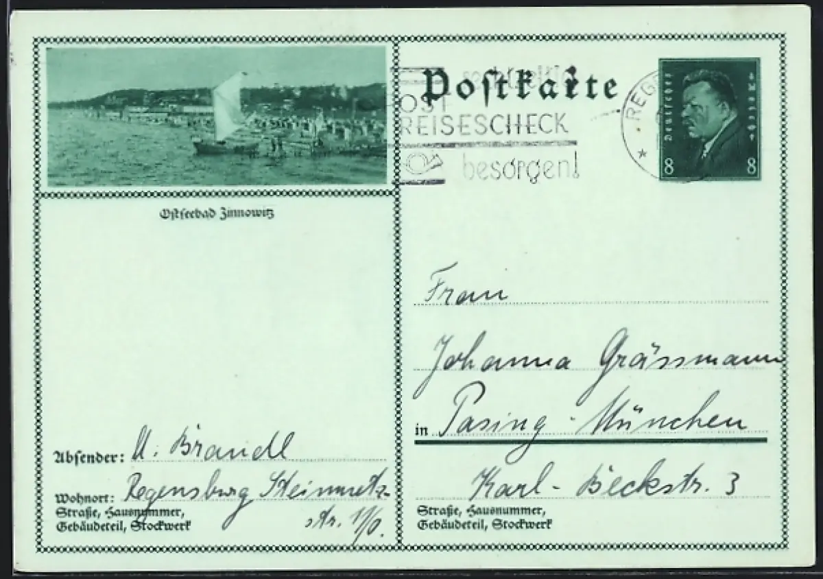 AK Zinnowitz, Ostseestrand mit Zeesenboot, Ganzsache
