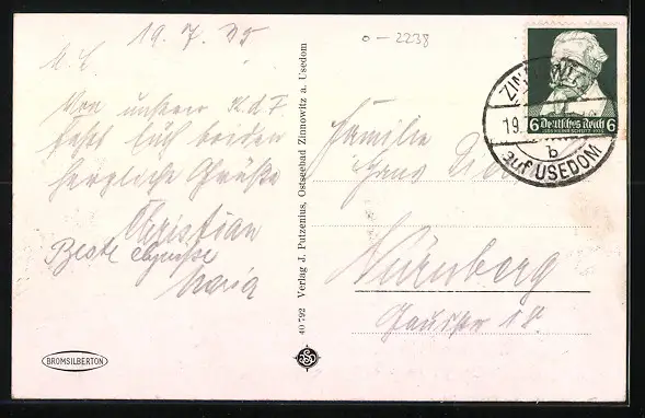Personenbezogene Daten auf der Rückseite der Karte wurden durch blauen Textmarker unkenntlich gemacht. Die blauen Stellen sind auf die Vorderseite durchgeweicht und wirken sich negativ auf das Postkartenfoto aus