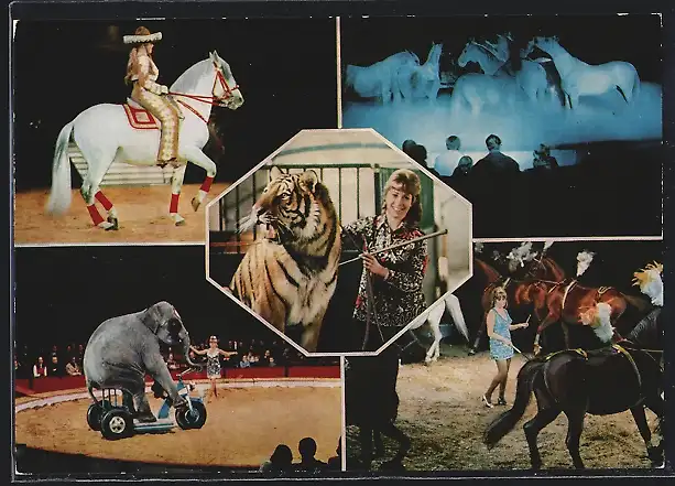 AK Zirkus Krone, Christel Sembach-Krone mit Tiger Ussur, Elefant Bijoya fährt Rad