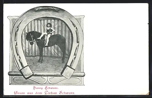 AK Zirkus Schwarz, Hanny Schwarz auf ihrem Pferd unter einem Hufeisen
