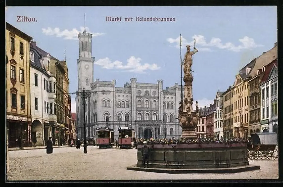 AK Zittau, Markt mit Rolandsbrunnen, Strassenbahn
