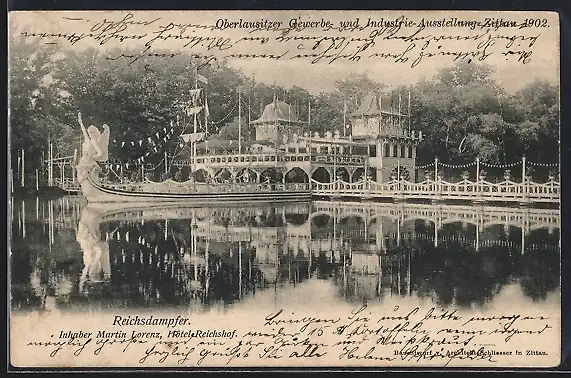AK Zittau, Oberlausitzer Gewerbe-u. Industrie-Ausstellung 1902, Reichsdampfer mit Ausstellungsgebäude