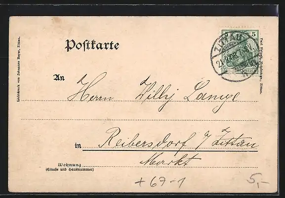 alte Ansichtskarte, gelaufen 1908, Bugspur re. vertikal, Bugspur re. oben, guter Zustand