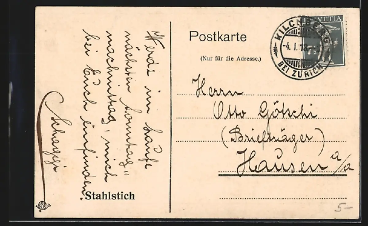 Personenbezogene Daten auf der Rückseite der Karte wurden durch blauen Textmarker unkenntlich gemacht. Die blauen Stellen sind auf die Vorderseite durchgeweicht und wirken sich negativ auf das Postkartenfoto aus