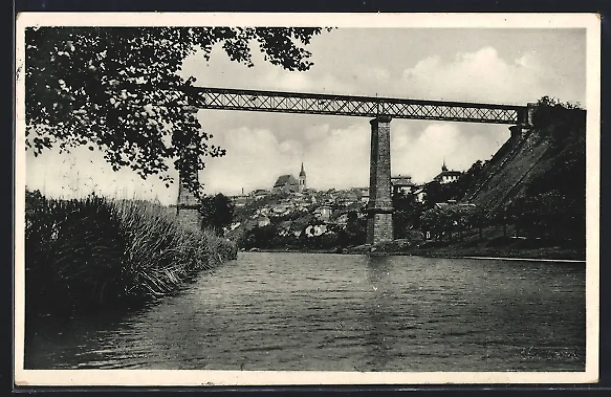 AK Znaim, Ortsansicht mit Viadukt, Flusspartie
