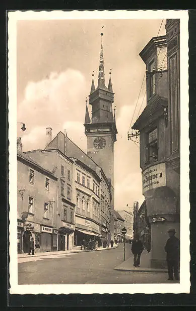 AK Znaim a. d. Thaya, Strassenpartie mit Rathausturm