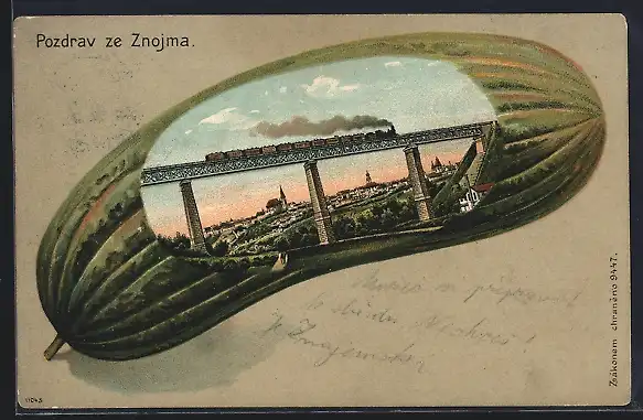 AK Znojma, Eisenbahnbrücke, Ansicht auf Gurke