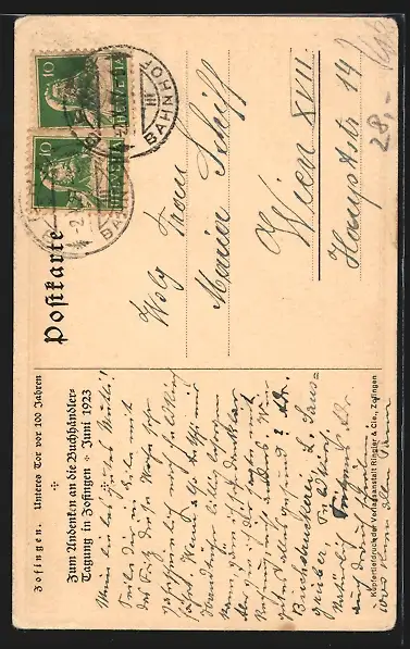Personenbezogene Daten auf der Rückseite der Karte wurden durch blauen Textmarker unkenntlich gemacht. Die blauen Stellen sind auf die Vorderseite durchgeweicht und wirken sich negativ auf das Postkartenfoto aus