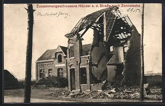 AK Zonnebeke, Zusammengeschossene Häuser an der Strasse nach Zonnebeke