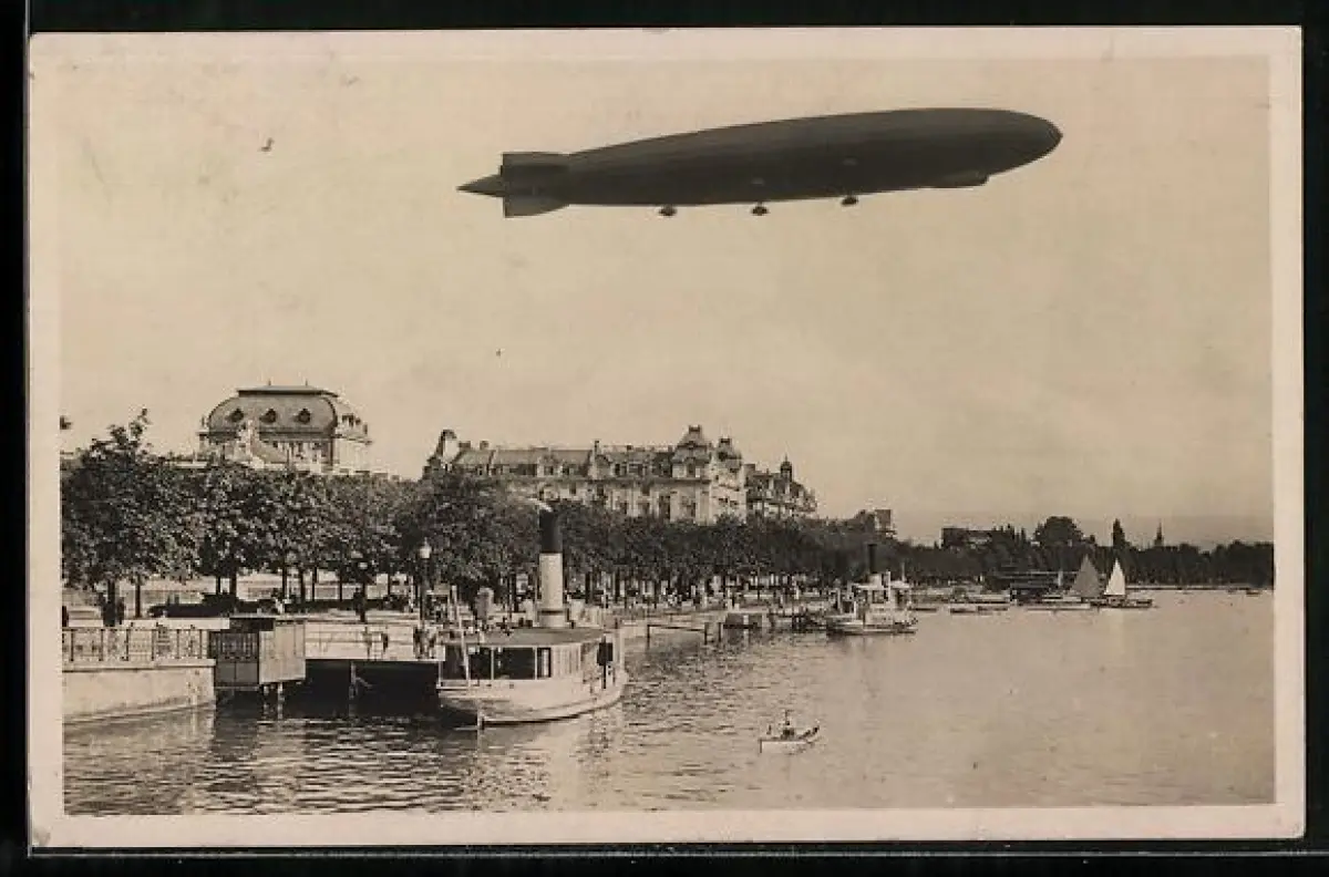 AK Zürich, Amerika-Zeppelin über der Stadt, Dampfer