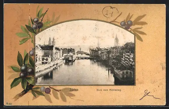 AK Zürich, Blick vom Mühlesteg, Passepartout mit Olivenzweig