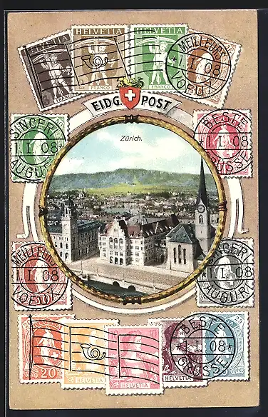 AK Zürich, Eidg. Post mit Strasse aus der Vogelschau, im Rahmenkranz, Schweizer Briefmarken