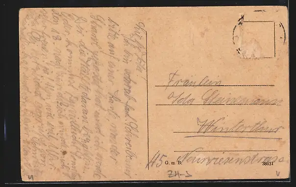 Personenbezogene Daten auf der Rückseite der Karte wurden durch blauen Textmarker unkenntlich gemacht. Die blauen Stellen sind auf die Vorderseite durchgeweicht und wirken sich negativ auf das Postkartenfoto aus