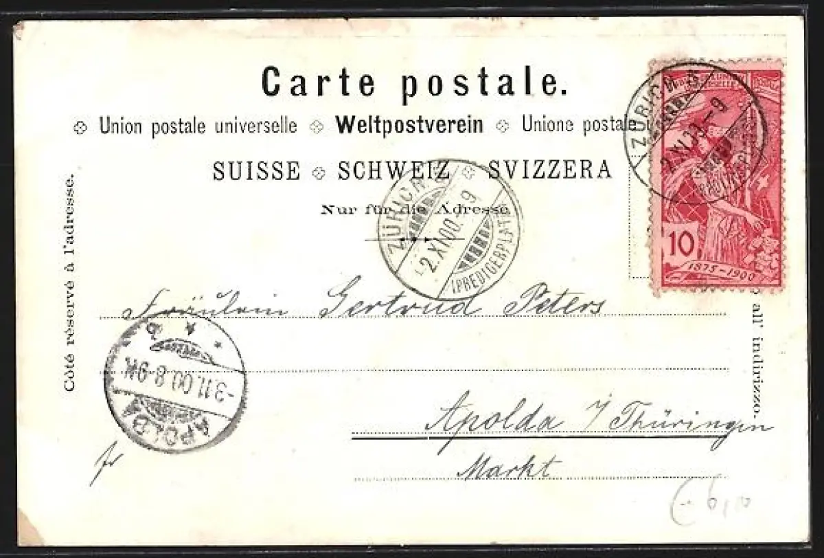gelaufen 1900, Eckknick oben re., Abriebspur unten re., Stempelspur, guter Zustand