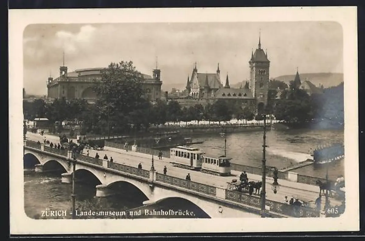 AK Zürich, Landesmuseum und Bahnhofbrücke mit Strassenbahn