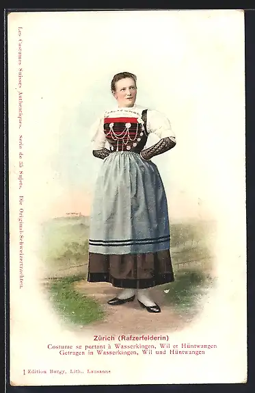 AK Zürich, Rafzerfelderin, Frau in Trachtenkleid, getragen in Wasserkingen, Wil und Hüntwangen