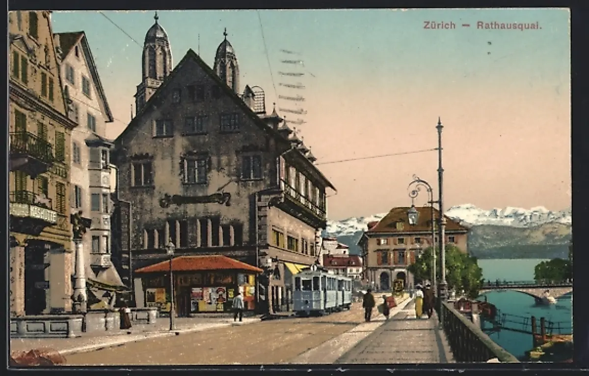 AK Zürich, Rathausquai mit Strassenbahn und Passanten